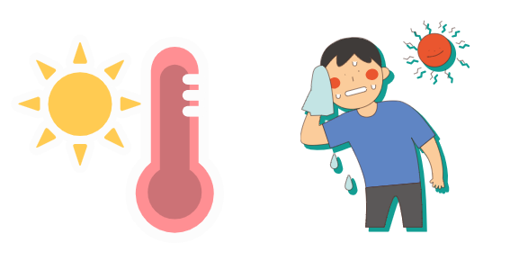 - 증상: 태양열 아래 오랜 시간 노출되었을 경우 체온은 매우 높지만 땀이 나지 않는 상태가 되고 두통과 구토 증세를 동반하며 심할 경우 의식을 잃을 수 있습니다.